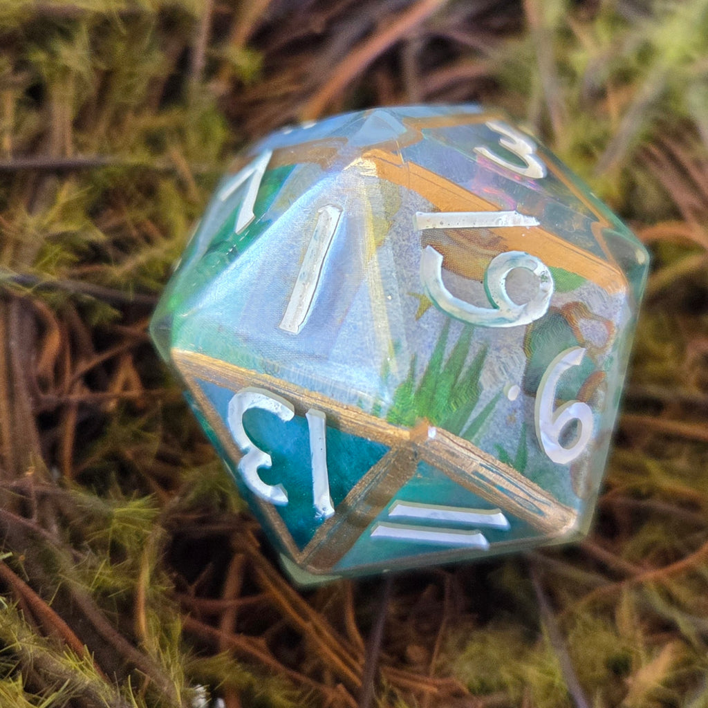 This is an oversized 30mm D20 made with custom mold and font exclusive to my shop and my trademarked logo replacing the #20 side! Design is an insert with areas of opal flashes -accented insert with a centralized band around the insert that features plants, Potions, ect and metallic gold edges. The closer you look, the more detail you can see.  Finished die is polished to a shine and inked with white acrylic paint with a shimmery overcoat on #20/logo face