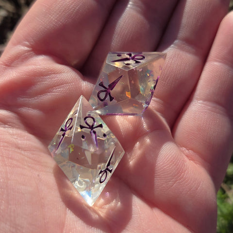 Listing is for a matching pair of Vampyr: The Masquerade TTRPG Gaming Dice D10s. One with skull and one without. Images inked a base white acrylic with purple on ahnk faces and glittery pink over the skull