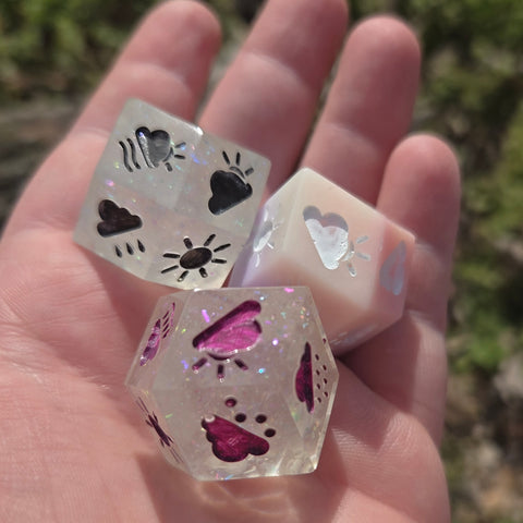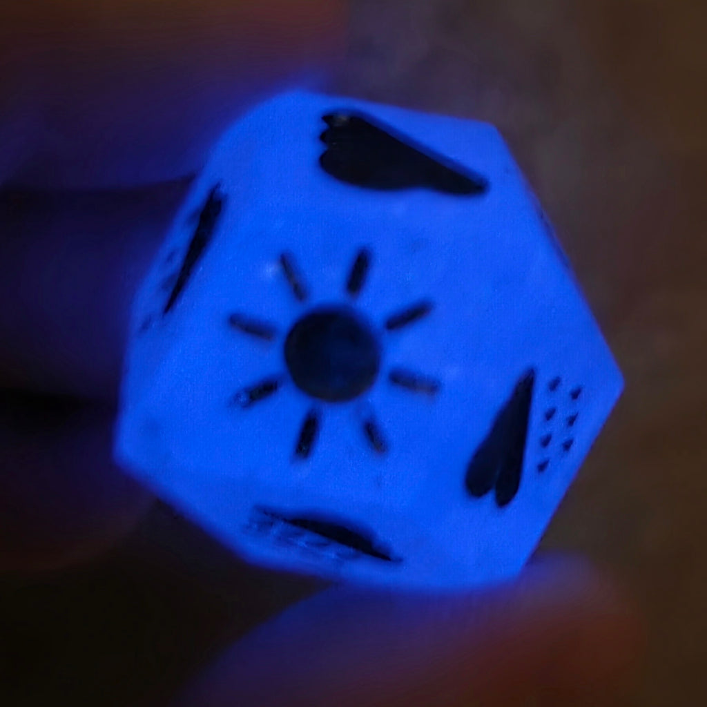 These oversized (20mmish) D12s have a different weather images on each face. Sold Individually. Each die is inked in a white or black base acrylic paint with colors complimenting the dice design painted over each image. Unless noted in individual listing, finish will be glasslike polished.