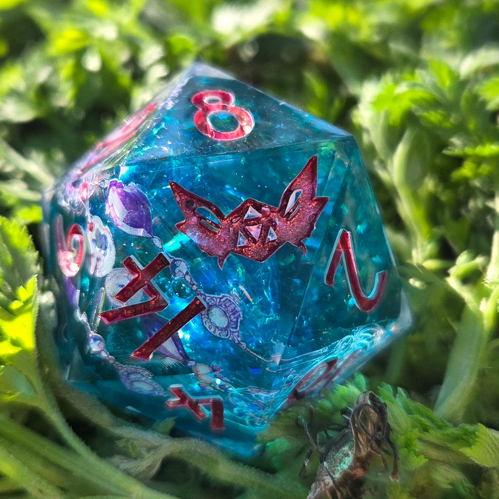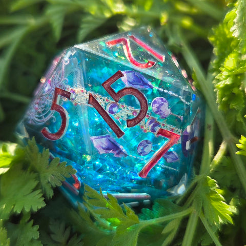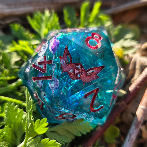 This is an oversized 30mm D20 made with custom mold and font exclusive to my shop and my trademarked logo replacing the #20 side! Design uses a translucent with shimmery opal flakes insert in teal green blue with mylar for added colorshift.