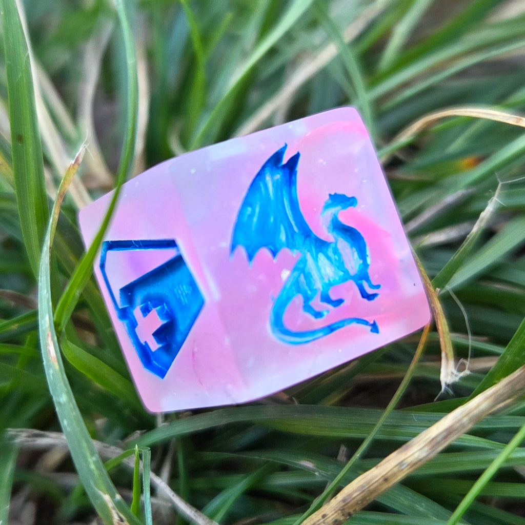 These 15mm D6s have a different Monster or Creature image on each face (Giant, Dragon, Mimic, Gelatinous Cube, Owlbear, Vampire/Undead). Each die is inked in a white base acrylic paint with colors complimenting the dice design painted over each image- some with a shimmery overcoat! Glass-like finish unless noted in individual listings :)
