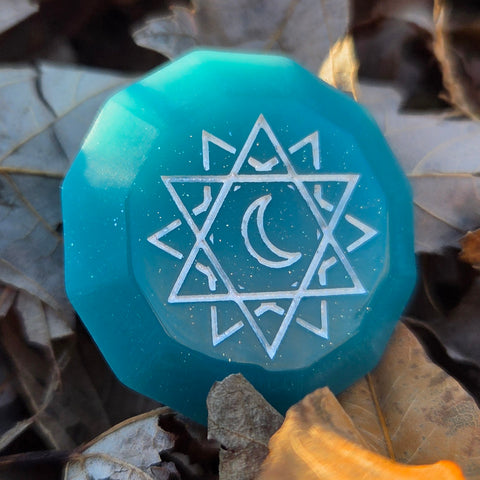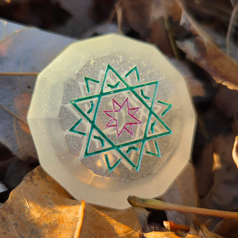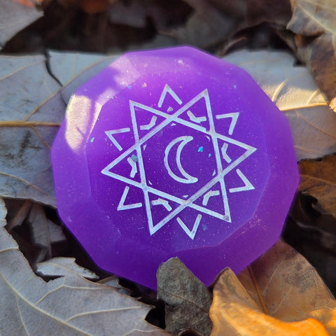 Beveled D2 or Coin- one side features a sun motif and the other side is a crescent moon. This one has the flat faces polished to a glass-like shine and the beveled edges are frosted for effect with the mylars/opalescent flakes.