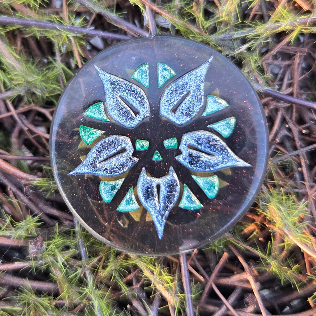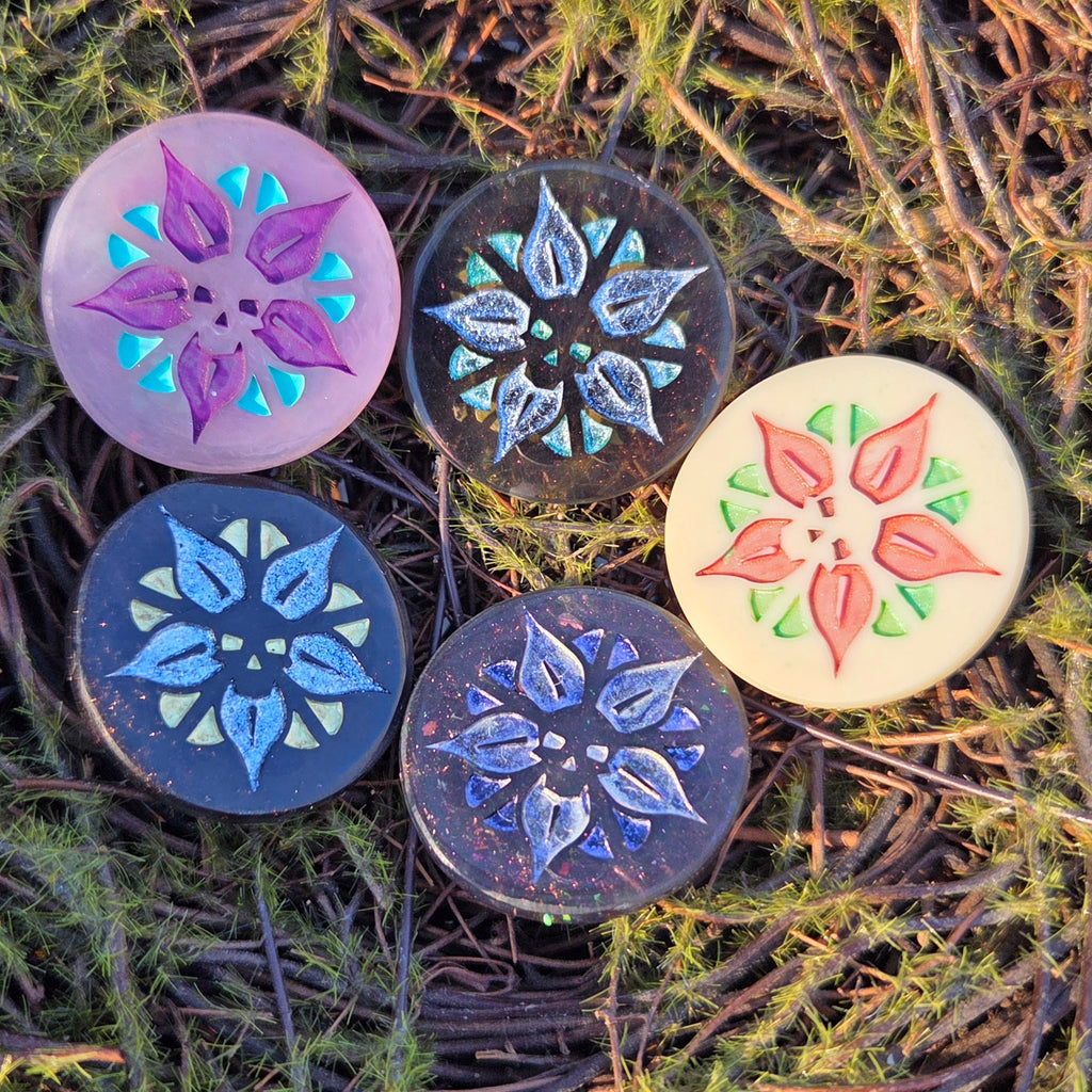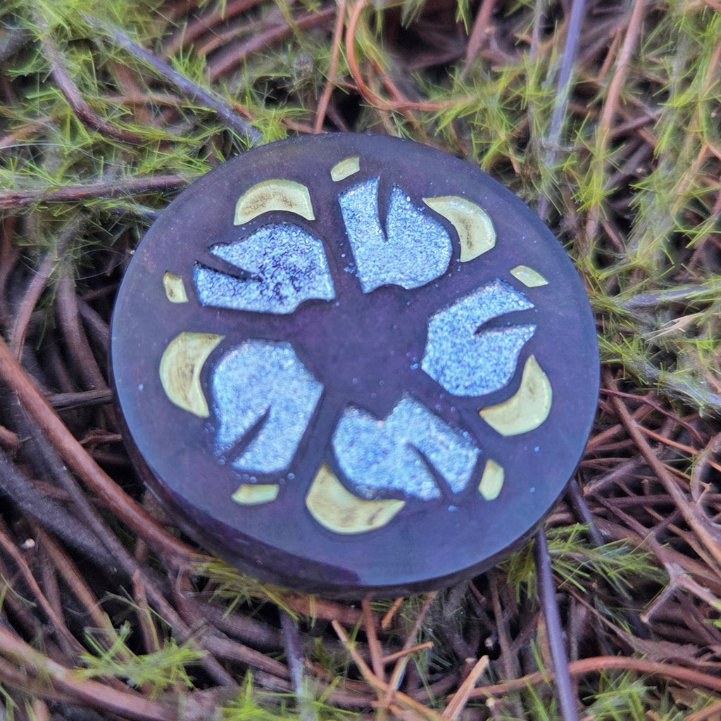 D2 or Coin- one side features a central skull with floral accent and the other side has a central heart with floral accenting. Both sides are polished to a shine (except faux bone tone).